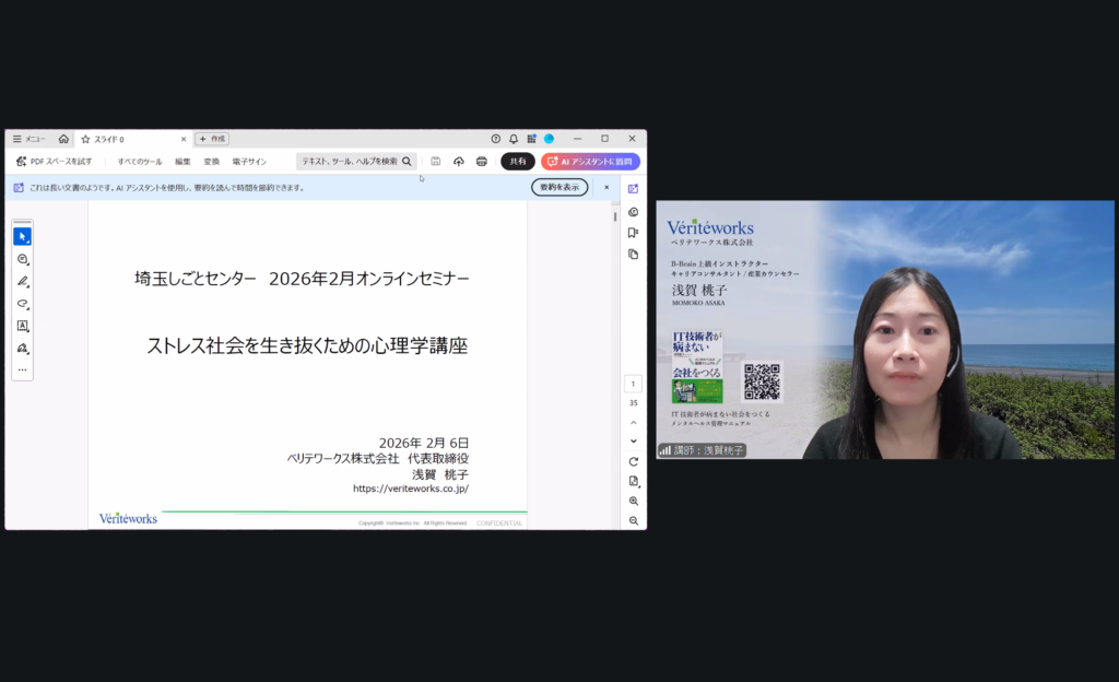 本日は、ベリテワークス株式会社の浅賀桃子さんを講師にお迎えし、「ストレス社会を生き抜くための心理学講座」を開催しました。